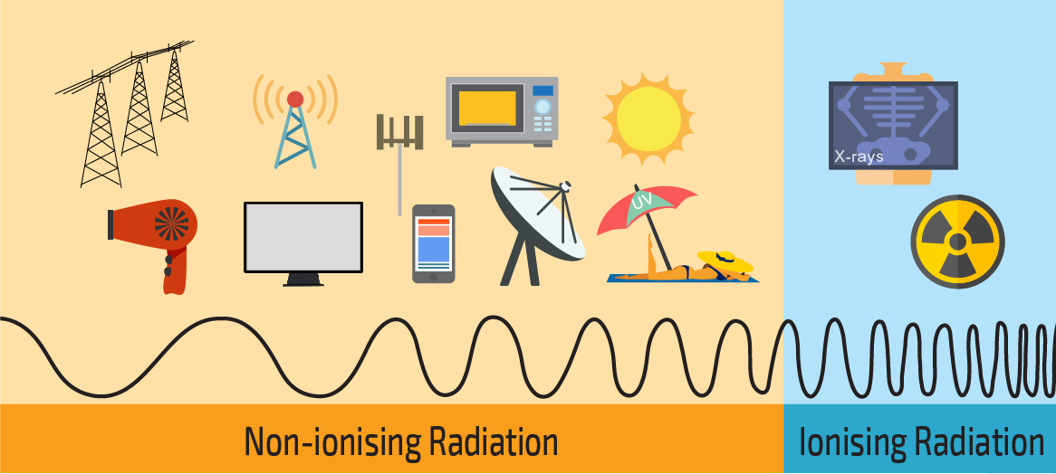 Mobile communications devices in operation generate radio frequency (RF) electromagnetic field which is a type of NIR. In contrast to ionising radiation such as X-ray, NIR has lower energy which is insufficient to change the chemical properties of substances or to cause harm by breaking chemical bonds inside the human body.